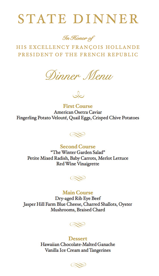 The menu celebrated the history between the US and France; much of the produce homegrown in the White House Garden and on farms across the states. That’s not to say the meal wasn’t costly. Caviar and rib-eye is not exactly an economically conservative choice.