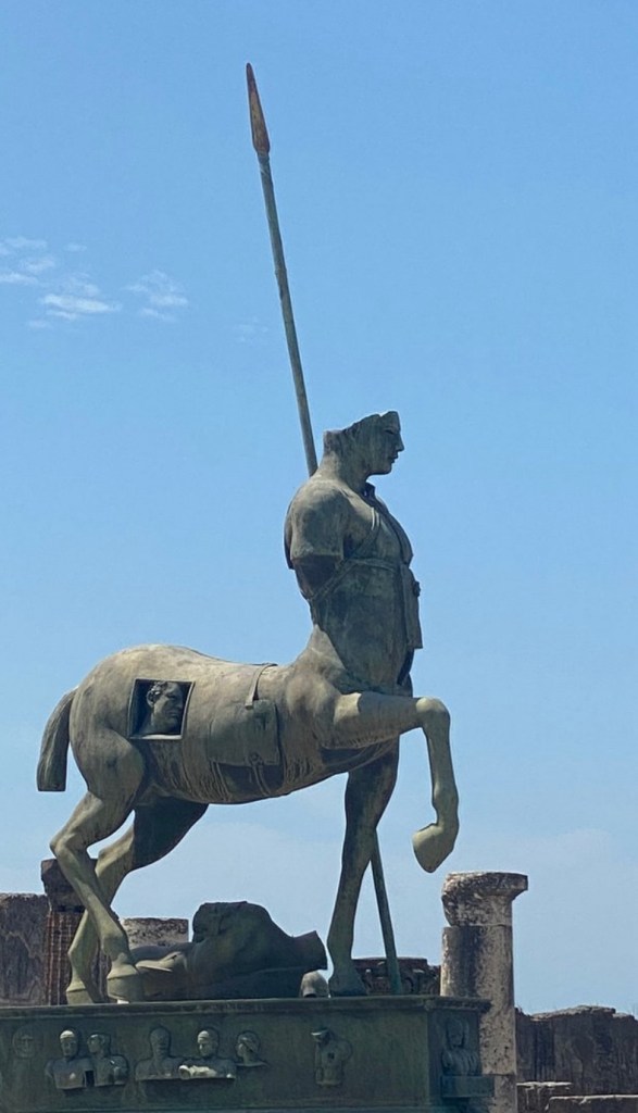 We had a long walk at top speed from the bus to the entrance of the site. The path in was lined with booths selling all manner of souvenirs; tee shirts, models of Pompeii sculptures, postcards, and more.