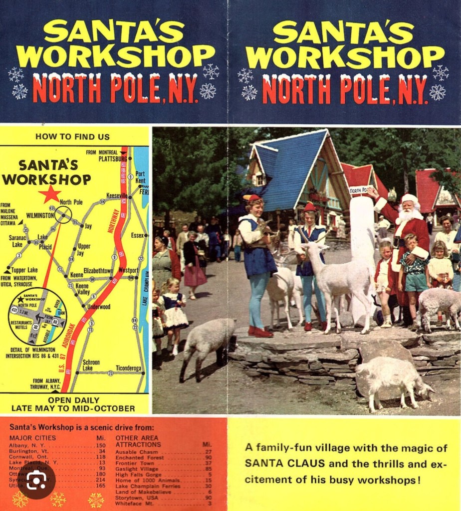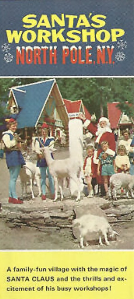 On the same trip we went to Santa’s Workshop at The North Pole, New York. Set in the northern Adirondack Mountains, it was a wonderland. Not only were Santa and Mrs Claus present, there were elves and reindeer! I vaguely recall goats and some small kiddie rides. The most amusing part of the visit was being in the North Pole in August!